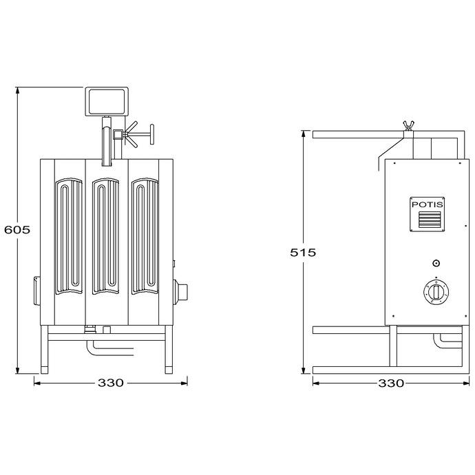 Höjd (inklusive motor): 605 mmBänkyta: 330 x 330 mmAntal keramiska element: 3 x 1kWEffekt: 3 kWAnslutning: 230V / 1-fasMaximal vikt (kött): 7 kgMaximal höjd (kött): 250 mmRund fett-låda Ø320 x 42 mm